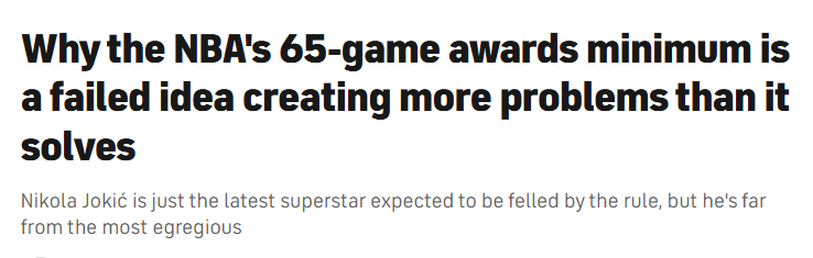 这一批评不仅针对65场规则,也指向了最佳阵容评选与薪资挂钩的机制,但两者在这一案例中紧密相关。现在,球员们有了一个明确的目标需要达成。